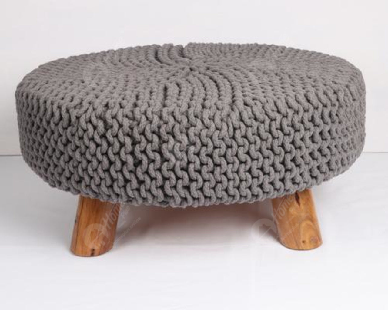 Filling with Structured Wood Frame with 100% Cotton lnitted coving. This stool has three wooden support legs. We offer around 6 colours.